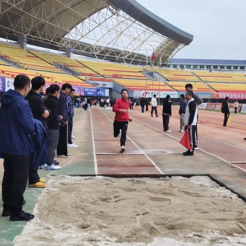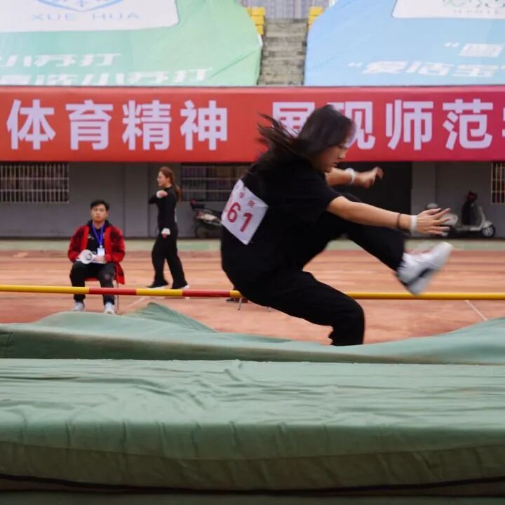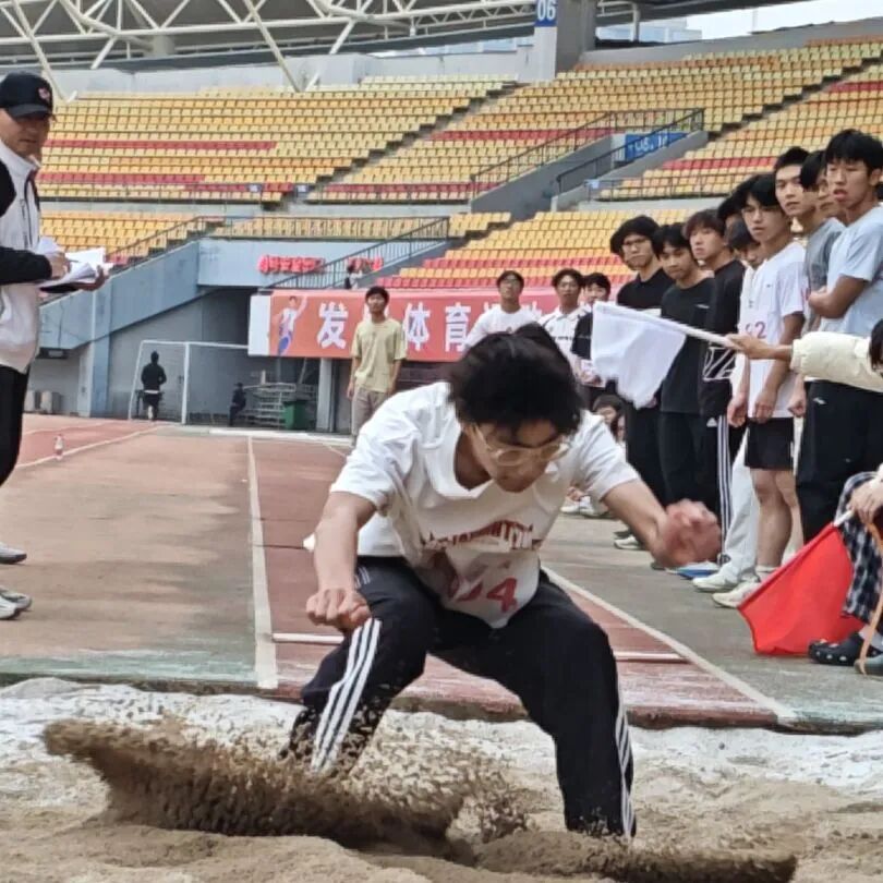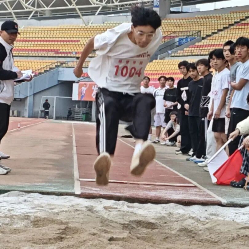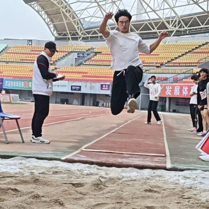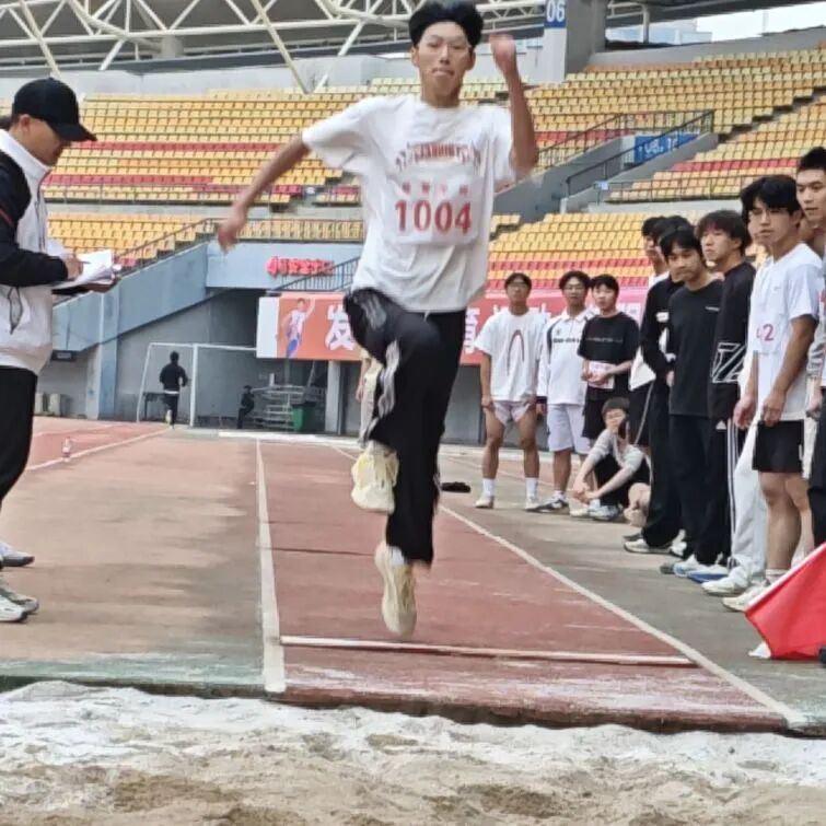 目光锁定前方,脚步沉稳有力,最后奋力一跃,每一步都透着一股认真劲。