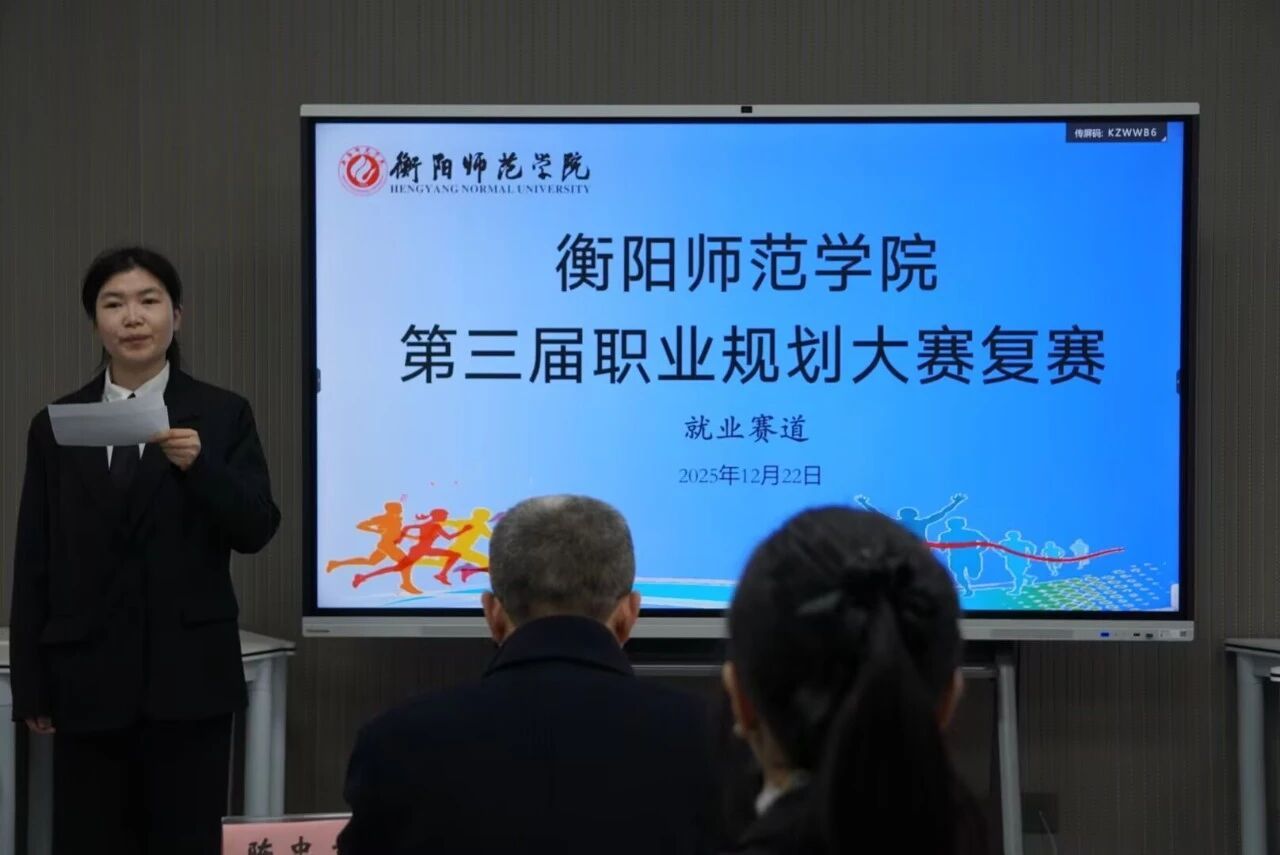 2025年12月22日,衡阳师范学院第三届大学生职业规划大赛复赛在东校区九章楼201、217顺利举办。本次大赛由衡阳师范学院招生与就业指导处主办、经济与管理学院承办。衡阳市红海人力资源公司副总张婷、衡阳考德上校长邓承轩、良师教育校长邹高增、学生工作部副部长黄懿、经济与管理学院副院长陈忠文、图书馆教师刘璐担任评委。