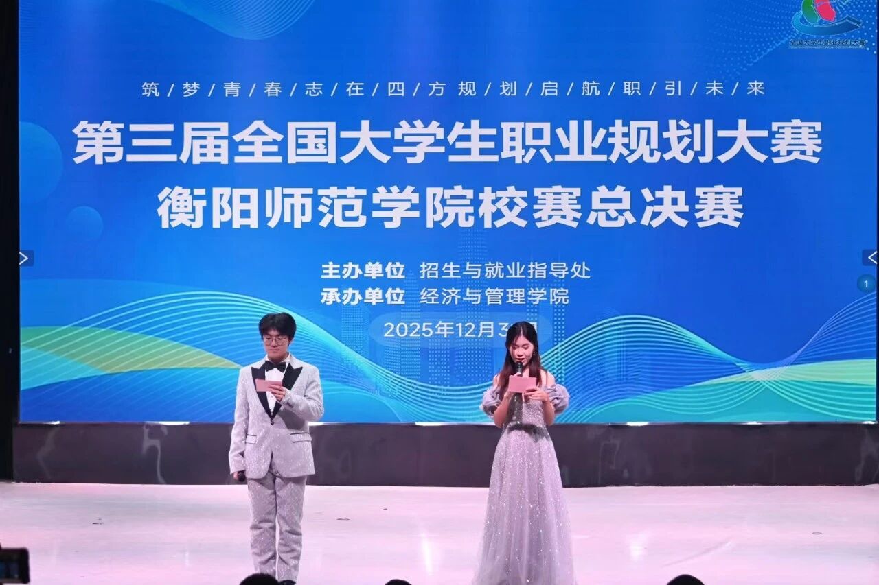 2025年12月31日下午2点,由我校招生与就业指导处举办,经济与管理学院承办的衡阳师范学院第三届职业规划大赛决赛于音乐楼演播厅盛大开幕。本次大赛以“筑梦青春志在四方,规划启航职引未来”为主题,衡阳市就业服务中心三级调研员曹云、衡阳市第九中学副校长王朝阳、鸿海人力公司副总张婷、湖南工学院就业指导教研室副主任喻双江以及衡阳师范学院工会常务副主席张波勇、学生工作部副部长黄懿、外国语学院副院长何文娟担任评委。