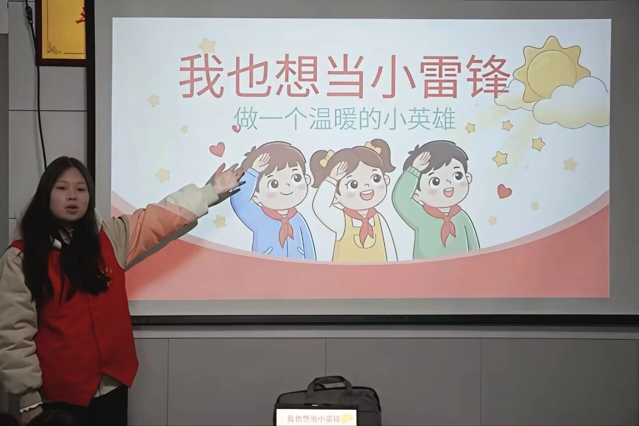 活动伊始,志愿者精心制作动画视频形式的PPT,将雷锋帮大嫂买票、冒雨送老人回家等经典故事以生动画面呈现。节奏舒缓,画面温馨,配合志愿者细致的手势引导,孩子们目不转睛,时而用手指着屏幕,用稚嫩的表情与动作表达着对雷锋的敬佩与喜爱,课堂内暖意融融。