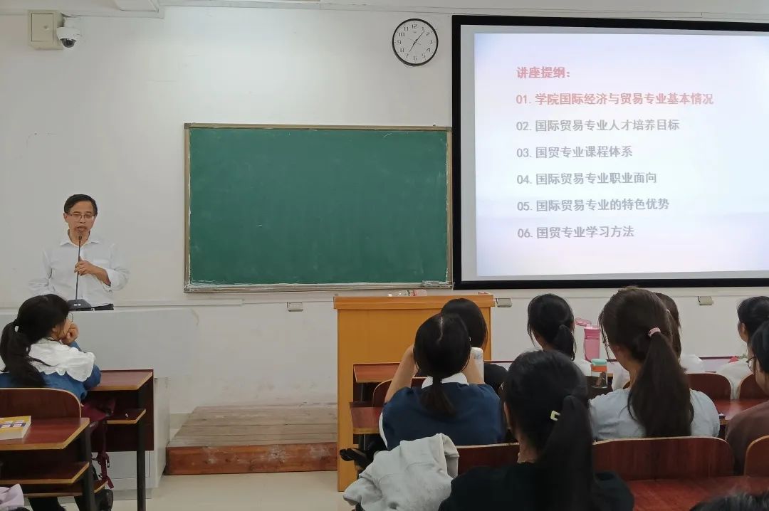 为了提升新生对国际经济与贸易专业的专业认同感,我院于10月5日晚上7:00在外语楼北408召开国际经济与贸易专业思想教育讲座,经济与管理学院院长肖黎担任此次讲座的主讲人。首先,肖院长结合他的亲身经历向同学们介绍了国际经济与贸易专业的基本情况详细介绍了本专业的相关内容。他指出,在不确定性高、风险性大的疫情背景下,国际经济与贸易专业依旧拥有良好的就业前景。接着,他解读了国贸专业培养目标以及专业课程,让新生们了解自己今后大学四年的学习方向。最后,肖院长怀着对全体国贸新生的期待与祝福赠言:“车到山前必有路,事在人为。”本次讲座进一步增强了学生们对本专业的认同感,明确了同学们之后的奋斗方向,坚定了同学们学习本专业的决心。