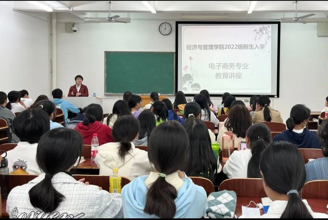 10月6日晚上19:00点,我院在外语楼北408教室举行了经济与管理学院2022级新生入学电子商务专业教育讲座,电子商务专业的唐琼博士担任此次会议主讲人。首先唐琼老师通过她带领学生的一些实习经验引入电商的概念,并提出了两个问题“你了解电子商务吗?”及“你为什么选择电子商务?”经过一段富有趣味性的问答后,唐老师就目前的情况指出了电子商务专业的现状和发展前景,特别指出了疫情期间电子商务发挥的积极作用和相关产业的蓬勃发展。在讲座最后,唐老师鼓励学生们多多参加院级、校级活动和比赛,勇于尝试,为达到自己的目标而努力奋斗。