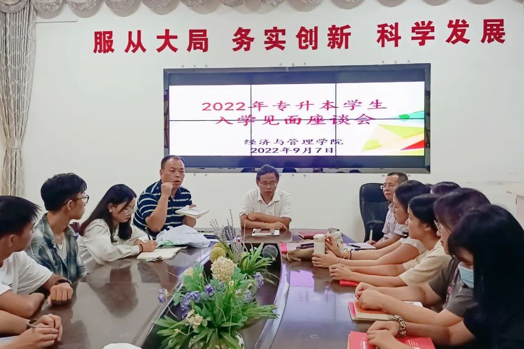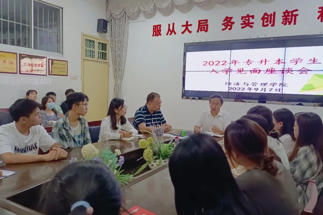2022年9月7日晚19:00,我院在文综楼C栋五楼会议室举行经济与管理学院2022年专升本学生入学见面座谈会。经济与管理学院院长肖黎、副院长陈忠文、党总支副书记周思敏、20级辅导员兼分团委书记黄智慧,以及全体专升本学生参加此次会议。会议由经济与管理学院党总支副书记周思敏主持。