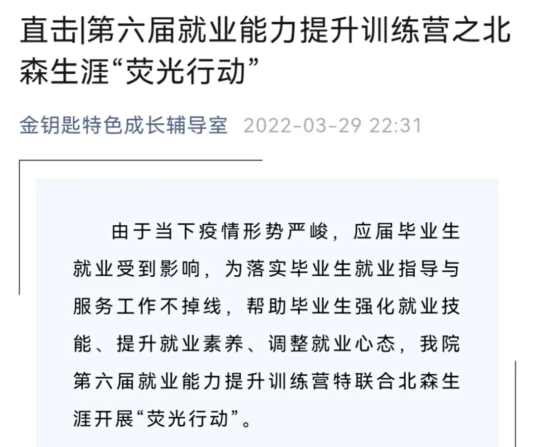 受新冠肺炎疫情影响,不少学校发布考研线上“云复试”方案。经管学院积极组织博士、教授为复试学生开展了专题辅导。将学生的复试时间进行了登记和合理排班,并严格按照“线上复试”的考场要求布置了2间考研“线上复试”专用办公室,确保每位考生在任何时段都能顺利进行“云复试”。为确保毕业生就业工作不断线,学院提前举办“第六届就业能力提升训练营”,联合北森生涯开展“荧光行动”从心理、就业、面试、简历等多个模块提供20节线上就业指导课程,帮助毕业生在就业压力与环境压力下快速调整心理状态,提升就业能力。