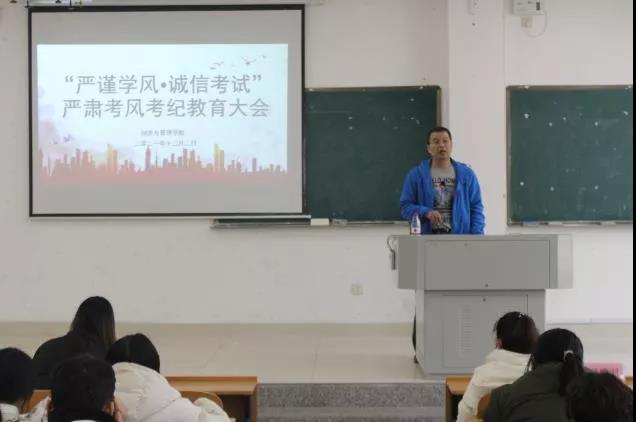 为严肃考风考纪,树立优良学风,保证期末考试的正常进行。我院于2021年12月2日中午13:00、12月3日中午13:00举办了“严谨学风·诚信考试”严肃考风考纪教育大会。经济与管理学院党总支副书记黄懿、副院长屈瑜君、教务秘书周楠老师以及21级辅导员李帅奇老师出席了本次会议,同时参加会议的还有第九届主席团成员、19-20级班长、学习委员以及我院21级全体同学。