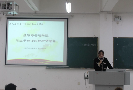 为增强学生干部的工作水准,提高我院学生干部在职素养,我院于11月26日中午13:00在理科楼南112教室开展了第九届分团委学生分会学生干部培训第六次课程,课程的主题为“学生干部任职经验分享”,2019级经济学二班的谢琼同学和2019级国际经济与贸易二班的孙宇硕同学担任主讲人,全体学生干部以及19-21级班长、团支书参加此次培训课程。